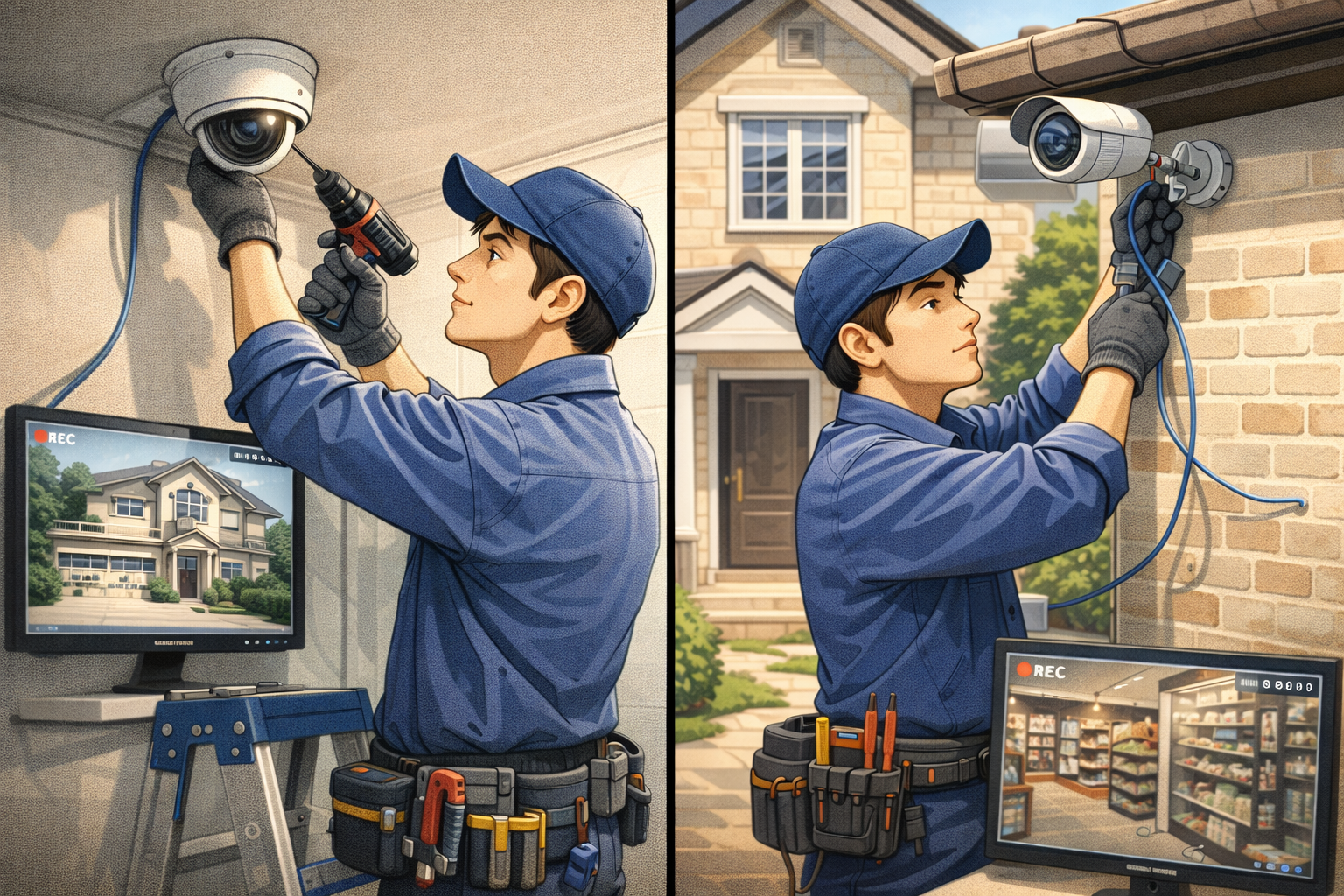 現地調査から機器選定、配線・電源工事、録画機(NVR/DVR)設定、ネット接続、スマホ遠隔閲覧設定までワンストップ。