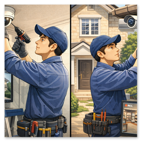 現地調査から機器選定、配線・電源工事、録画機(NVR/DVR)設定、ネット接続、スマホ遠隔閲覧設定までワンストップ。